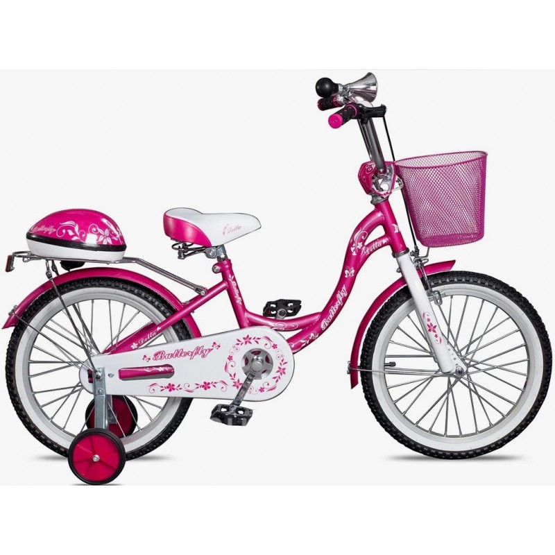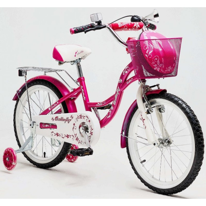 двухколесный велосипед с приставными колесами для девочек, возраст: 5-7 лет, рост: 105-115 см, сиденье: обычное (седло), колеса 18', рама: сталь Hi-ten, вилка жесткая, Сборка: Россия