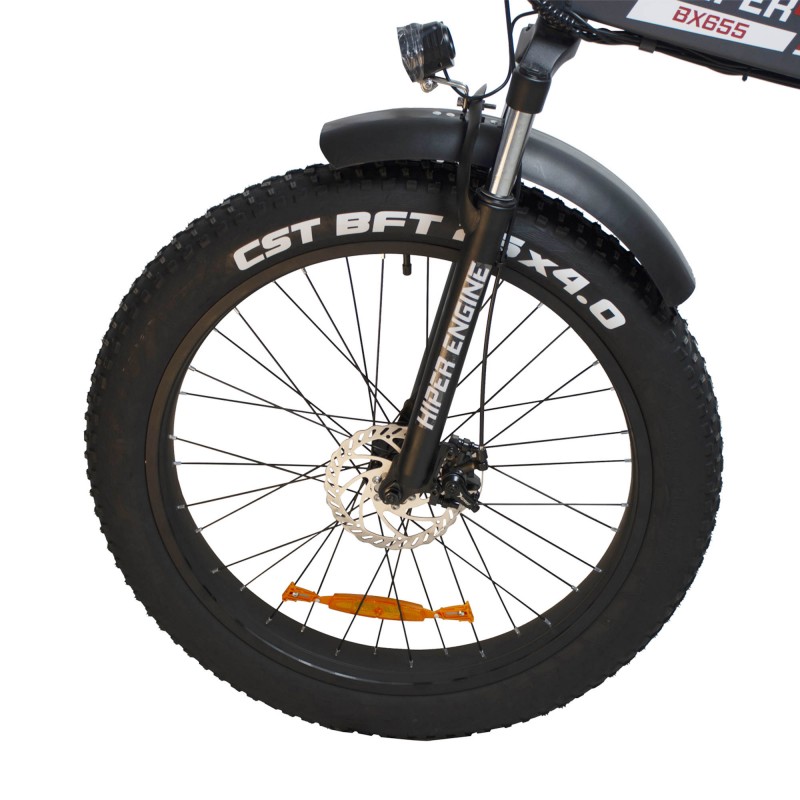 Электровелосипед HIPER Engine BX655 обладающий отличными характеристиками складной электровелосипед модель 2021 года имеет мощный функционал. Колёса с прочными мягкими шинами диаметром 26х4.0доставят удовольствие при поездках по грунтовым дорогам с песком и грязью. Среди оснащения модели стоит отметить следующее: