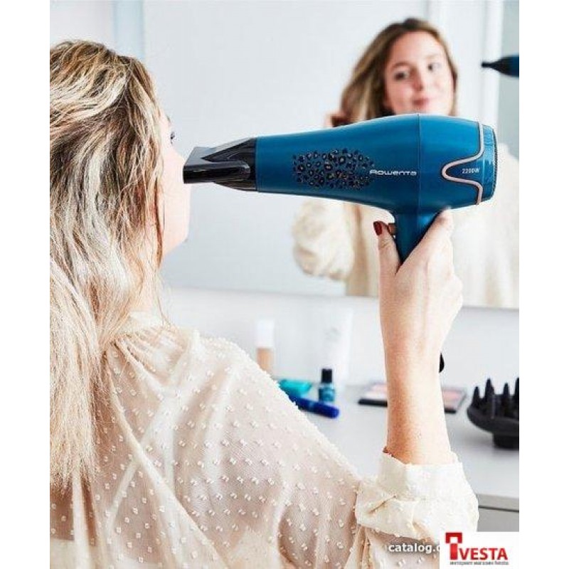 Фен Rowenta Motion Dry создан для того, чтобы сделать уход за волосами легким и комфортным. Мотор мощностью 2200 Вт подает воздух с высокой скоростью и позволяет высушить и уложить волосы за считанные минуты. Удобное управление и 6 настроек скорости/температуры обеспечивают оптимальный режим работы для вашего типа волос. Насадка-концентратор помогает тщательно просушить каждый локон и придать им форму, а насадка-диффузор приподнимает волосы у корней и создает естественные кудри. Дополнительные преимущества фена облегчают ежедневную сушку волос: легкий корпус, съемную решетку для легкой очистки, шнур длиной 1,8 м для свободы движений и мощный поток холодного воздуха для закрепления укладки надолго.