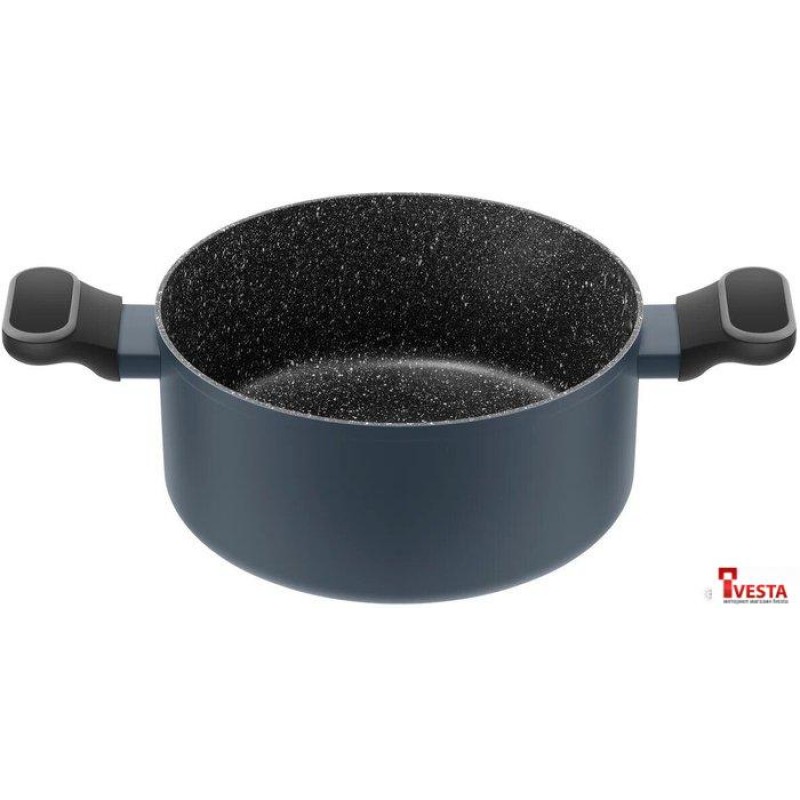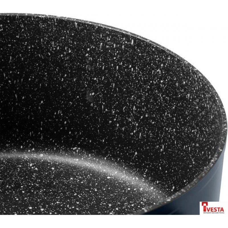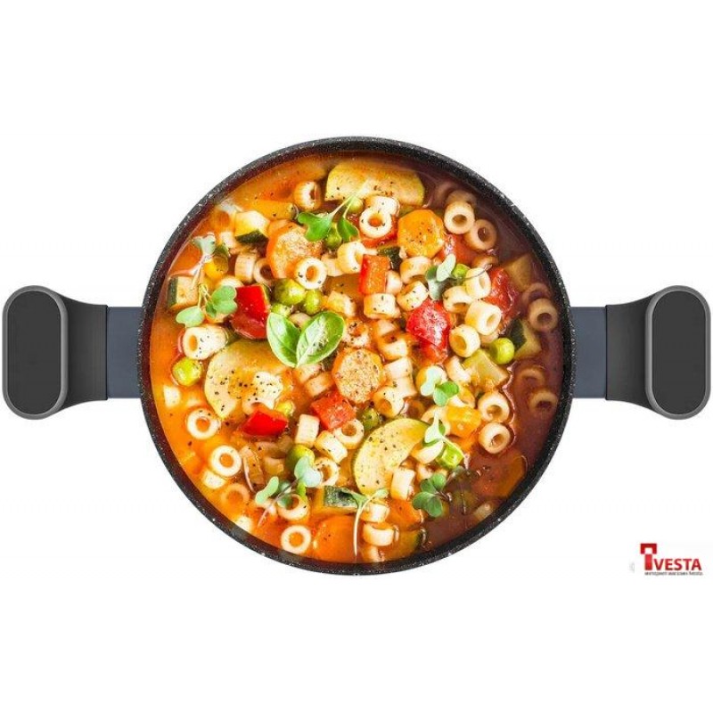 Мраморное антипригарное покрытие абсолютно инертно — это гарантирует, что в пищу не попадет никаких вредных примесей и веществ даже при воздействии очень высоких температур. Поверхность посуды не подвержена загрязнениям и не впитывает запахи.