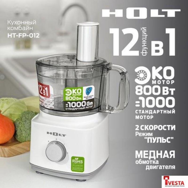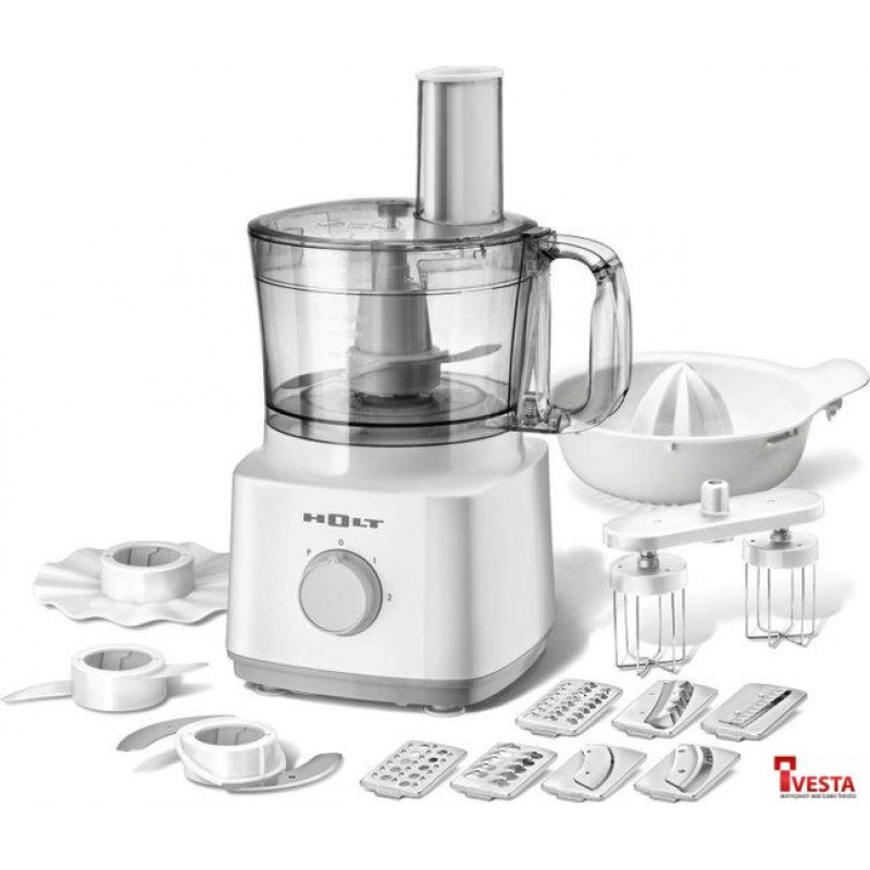 ✅ Кухонный комбайн Holt HT-FP-012 обладает множеством функций, включая цитрус-пресс, взбивание, смешивание, измельчитель, рубка, терка, шинковка и ломтерезка.
