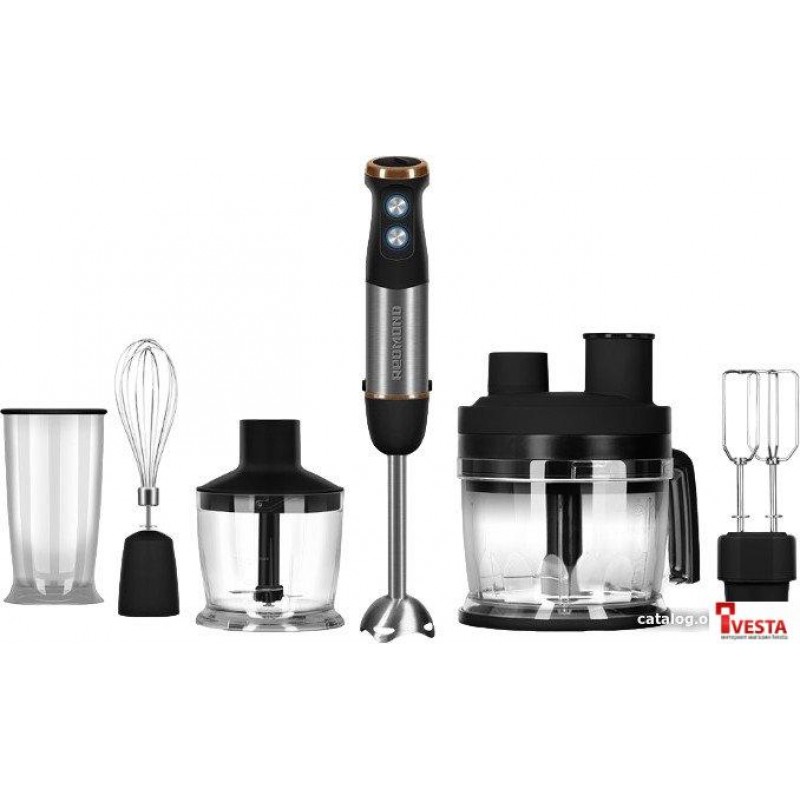 Многофункциональный прибор заменит сразу несколько устройств. В комплекте идут насадки для разных кухонных задач: смешивания коктейлей, вспенивания молока, помола кофейных зерен, взбивания муссов, блендирования, измельчения ингредиентов для салата. Также прибор справится с шинковкой овощей и фруктов за несколько минут.